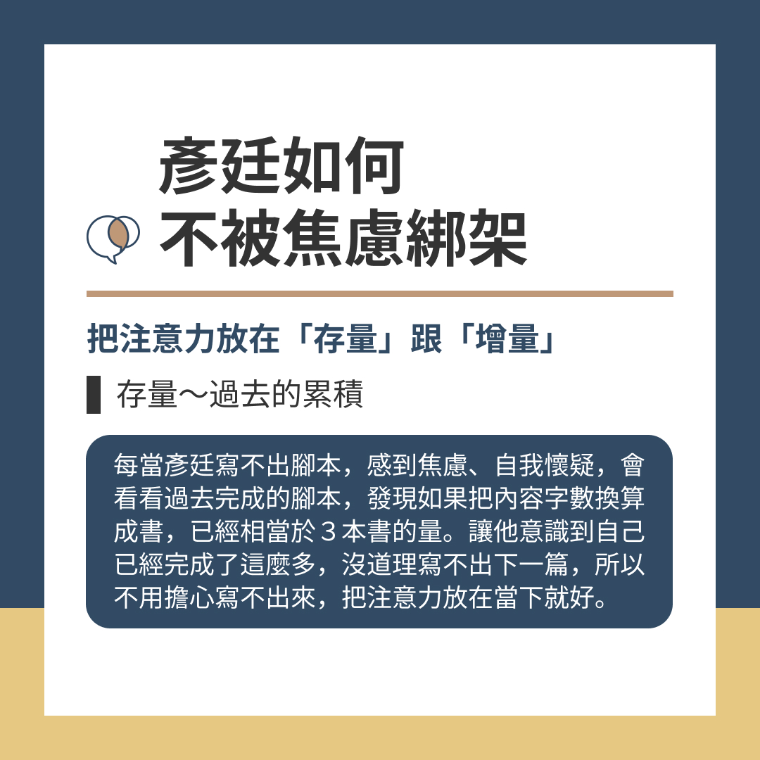 每當彥廷寫不出腳本,感到焦慮、自我懷疑時,會打開電腦裡的資料夾,看看過去完成的腳本,發現如果把內容字數換算成書,已經相當於3本書的量。這讓他意識到,自己已經完成了這麼多,沒道理寫不出下一篇,所以不用擔心寫不出來,把注意力放在當下就好。