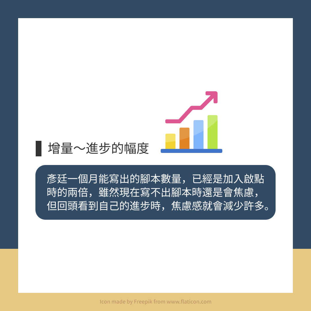 彥廷一個月能寫出的腳本數量,已經是加入啟點時的兩倍,雖然現在寫不出腳本時還是會焦慮,但當他回頭看到自己的進步,焦慮感就會減少許多。