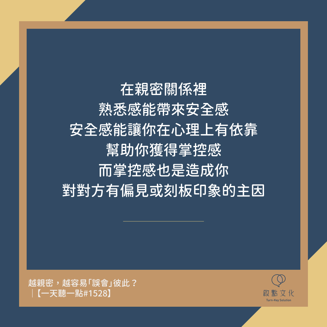 在親密關係裡,熟悉感能帶來安全感,安全感能讓你在心理上有依靠,幫助你獲得掌控感,而掌控感也是造成你,對對方有偏見或刻板印象的主因。