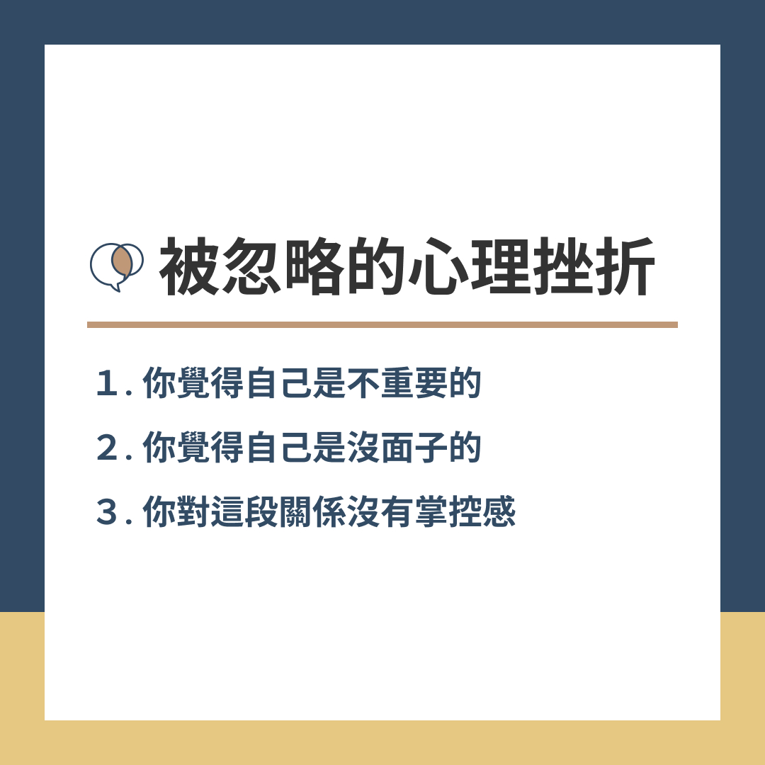 被忽略時,無論對方是故意或是不小心的,都會很直覺地產生「你對對方來說可有可無,甚至不需要存在」的信念