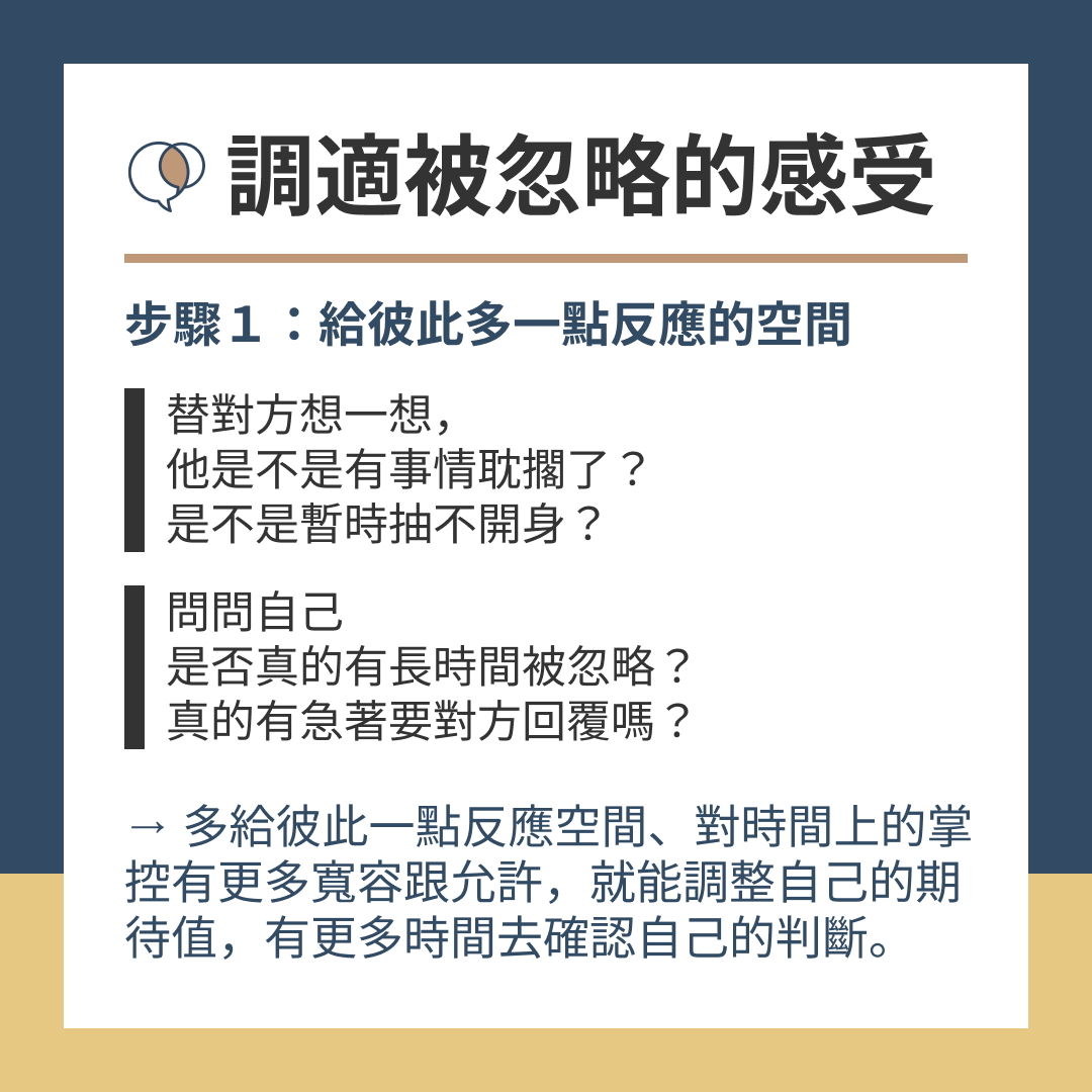 被忽略時,會搞不清楚對方跟自己的關係,到底還在不在,且擔心如果自己貿然跟對方核對、修復,可能造成更大的傷害