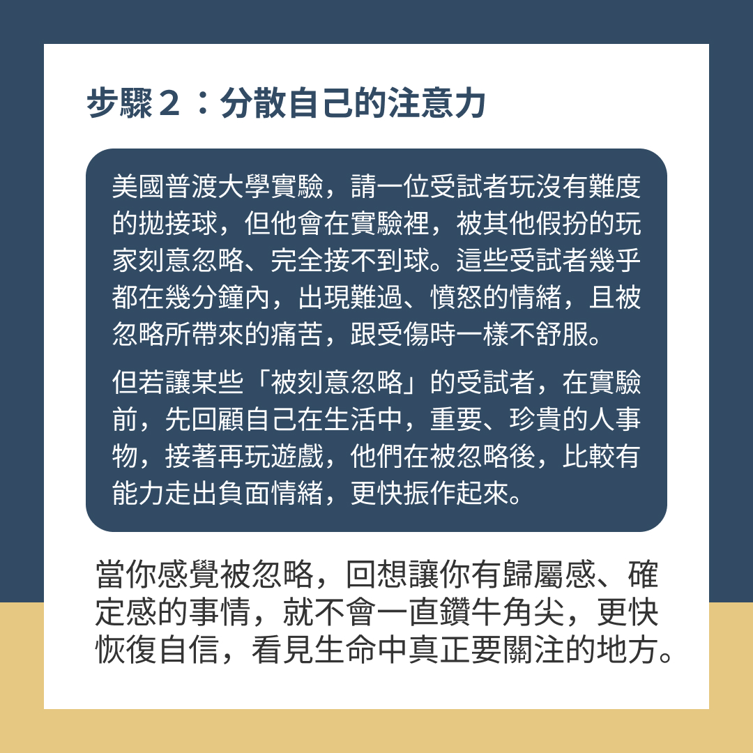 → 當你感覺自己被忽略,只要轉移注意力,回想讓你有歸屬感、確定感的事情,就不會一直鑽牛角尖,並且能更快恢復自信,看見生命中真正需要關注的地方。