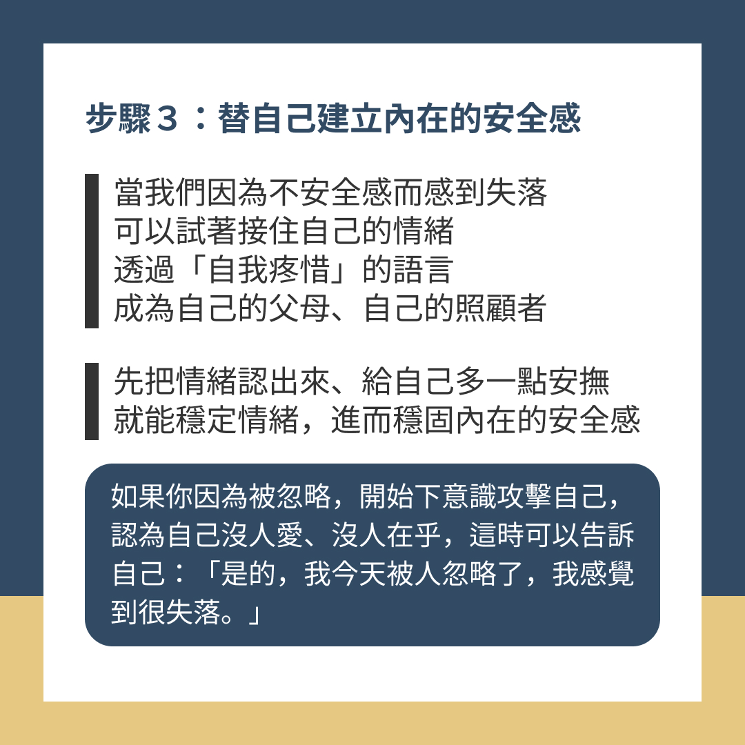 如果你因為被忽略,開始下意識地攻擊自己,認為自己沒人愛、沒人在乎,這時可以告訴自己:「是的,我今天被人忽略了,我感覺到很失落。」先把情緒認出來、給自己多一點安撫,就能穩定情緒,進而穩固內在的安全感。
