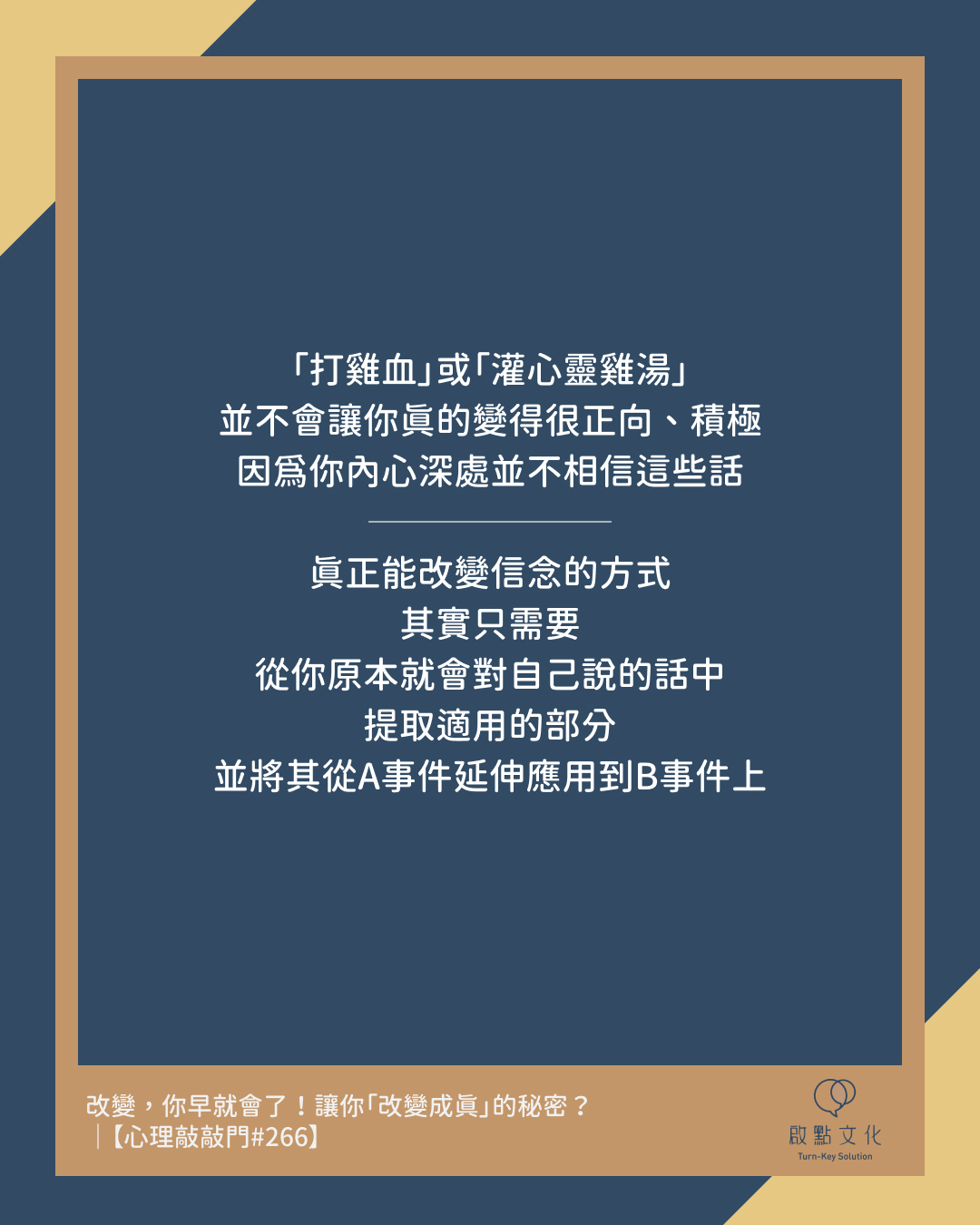 「打雞血」或「灌心靈雞湯」並不會讓你真的變得很正向、積極,因為你內心深處並不相信這些話。真正能改變信念的方式,其實只需要從你原本就會對自己說的話中,提取適用的部分,並將其從A事件延伸應用到B事件上就好。