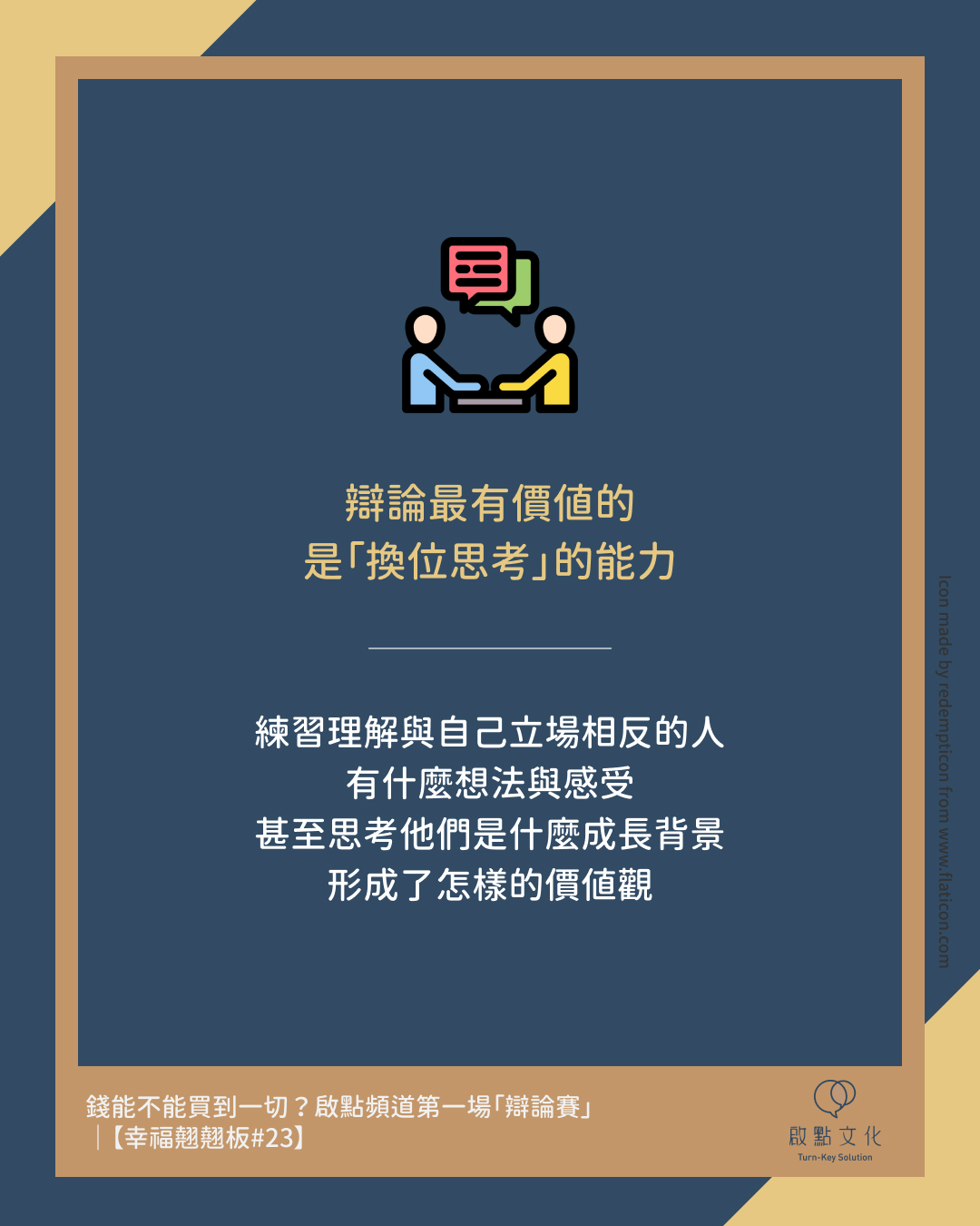 → 辯論最有價值的是「換位思考」的能力:練習理解與自己立場相反的人,有什麼想法與感受,甚至思考他們是什麼成長背景,形成了怎樣的價值觀。