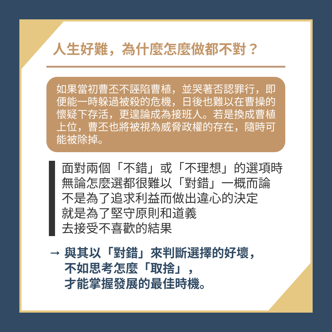 如果當初曹丕選擇當個好哥哥、好兒子,不誣陷曹植,並哭著否認罪行,即便能一時躲過被殺的危機,也給人一種軟弱的印象,日後難以在曹操的懷疑下存活或接班。若是換成曹植上位,曹丕也將被視為威脅政權的存在,隨時可能被除掉。