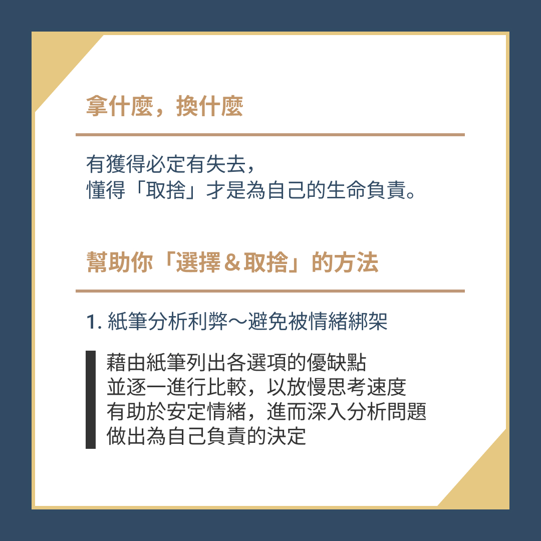 藉由紙筆列出各選項的優缺點,並逐一進行比較,以放慢思考速度,有助於安定情緒,進而深入分析問題,做出為自己負責的決定