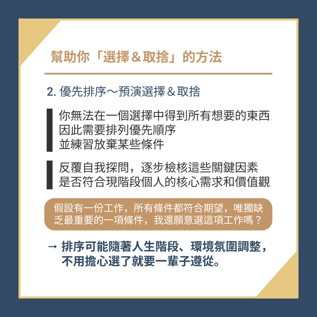 問自己:「假設有一份工作,所有條件都符合期望,唯獨缺乏最重要的一項條件,我還願意選這項工作嗎?」如果願意接受,代表原先認為最重要的條件並非不可或缺,可以試著重新排序。